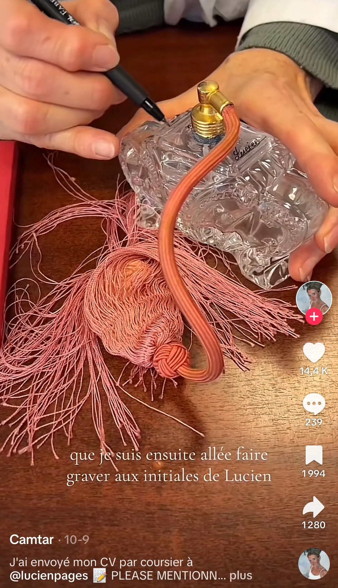 Tout dans cette vidéo Tiktok captive. Cameamea se démarque en adoptant les codes du fondateur du prestigieux cabinet de relations presse Lucien Pagès Communication (clients : Jacquemus, Courrèges, Ludovic de Saint Sernin, etc.). Chiner paraît logique ici : elle prend le temps de trouer l’objet idéal en ressourcerie, aligné avec l’image et la passion des flacons de parfum géants de Lucien Pagès. La candidate le sait : le soin apporté à la sélection de l’objet est plus précieux qu’un achat Amazon, impersonnel et sans valeur émotionnelle.