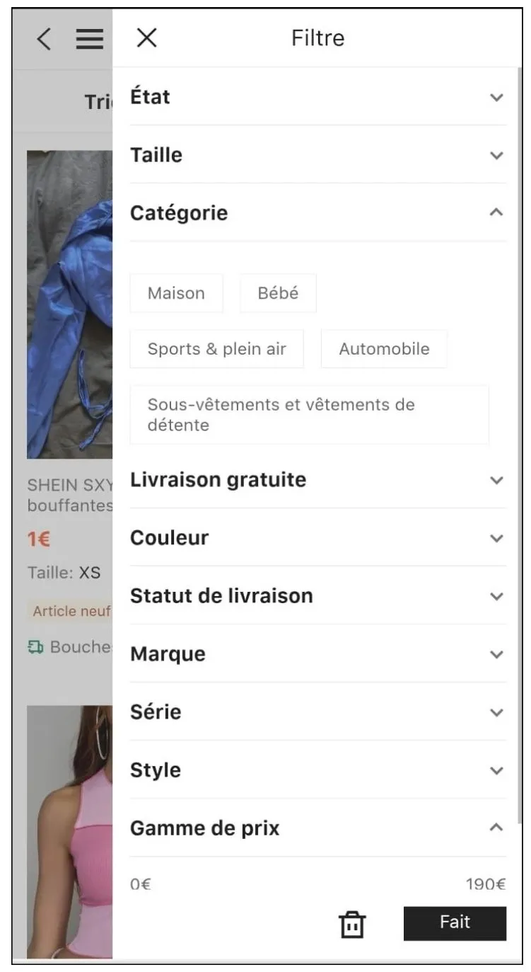 Pour affiner la recherche, des filtres, bien sûr, sont proposés. De quoi me rendre compte que le catalogue de catégories proposées est très varié pour la courte existence de ce site : 21 catégories en tout. Des "vêtements" à "l’automobile", en passant par la "téléphonie", les "jouets", les "fournitures pour animaux" la "décoration", le "plein air", les articles "bébés" et même "l’électronique". L’onglet "automobile" qui contient des accessoires est toutefois bien moins garni avec 29 articles proposés à l’heure où nous publions cet article, contre des milliers dans la catégorie "vêtements femme".